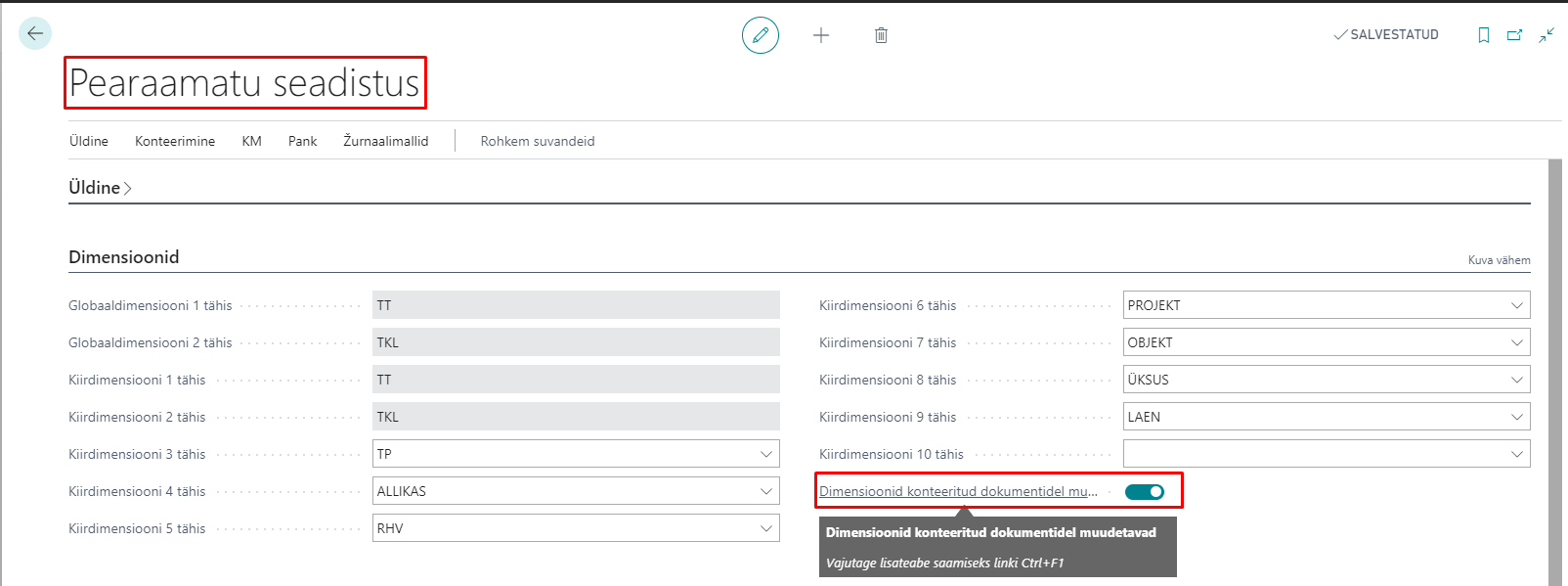 Pearaamatu seadistus lehel Dimensioonid kiirkaardile on lisatud marker „Dimensioonid konteeritud dokumentidel muudetavad“. Dimensioonide muutmiseks konteeritud kannetel, peab marker olema sisse lülitatud