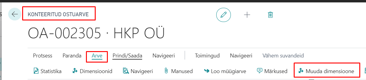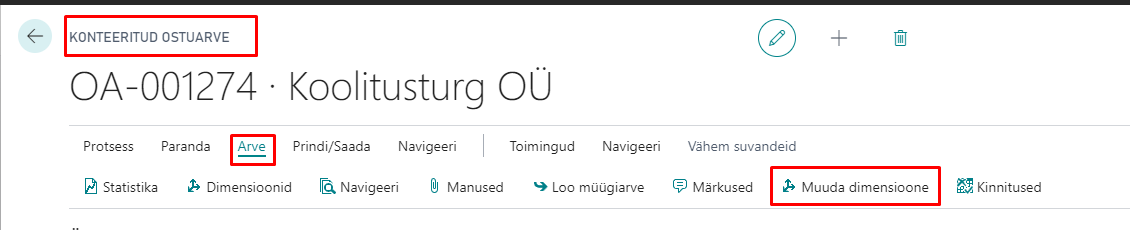 • Dimensioonide muutmine konteeritud kannetel. Selleks liigu soovitud dokumendi peale, näiteks konteeritud ostuarve. Ava Arve vahelehelt Muuda dimensioone valik