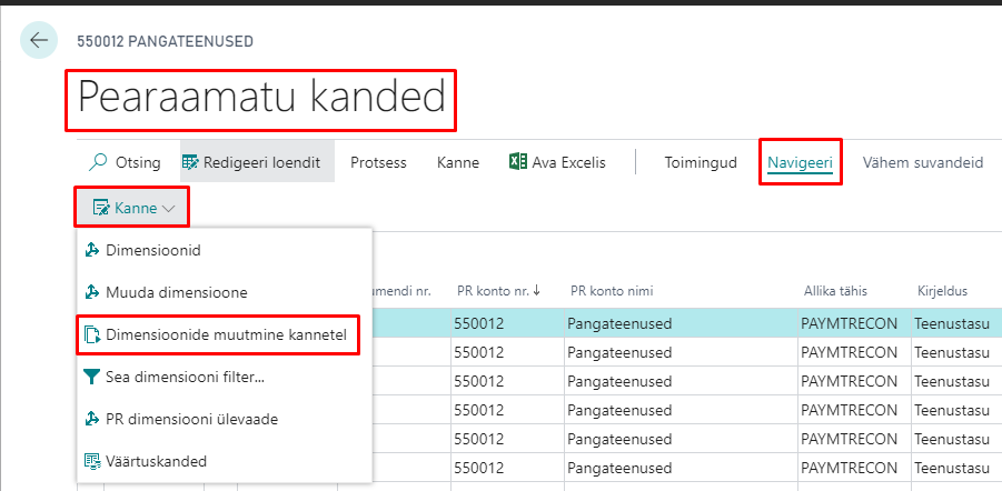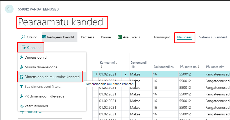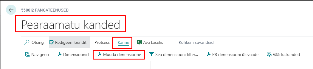 Pearaamatu kanded menüü punkti Kanne alla on lisatud nupp „Muuda dimensioone