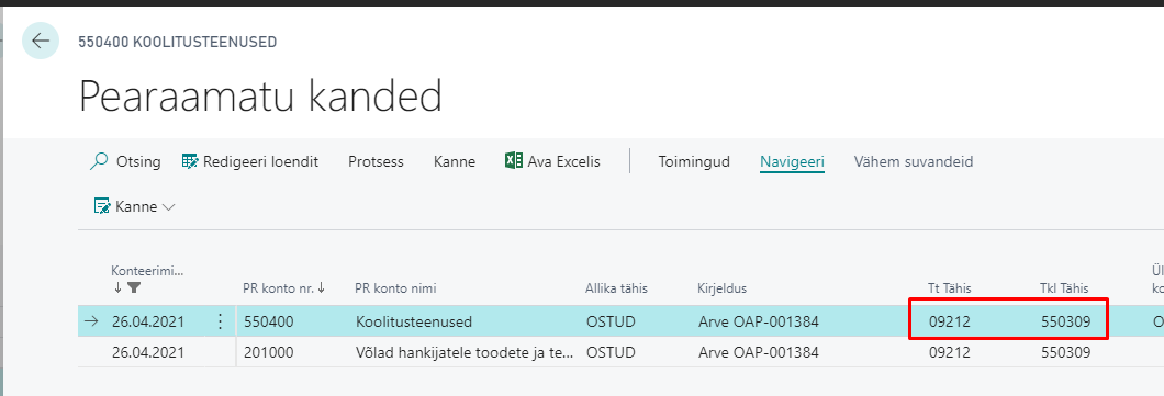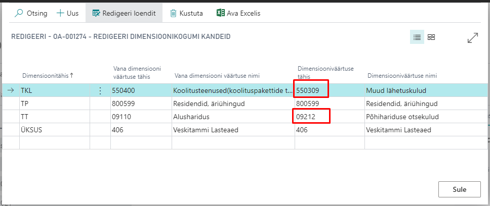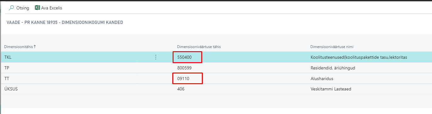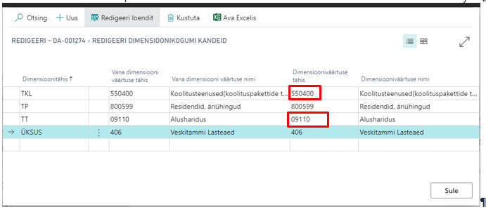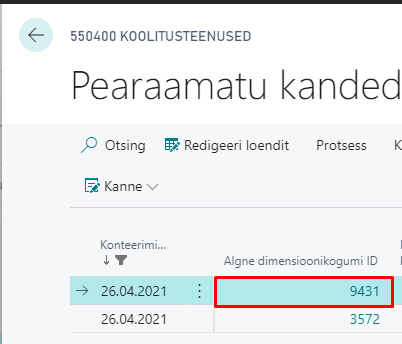 Esialgseid dimensioone saab vaadata pearaamatu kannetelt veerust „Algne dimensioonikogumi ID“ klõpsates väärtusele veerus.
