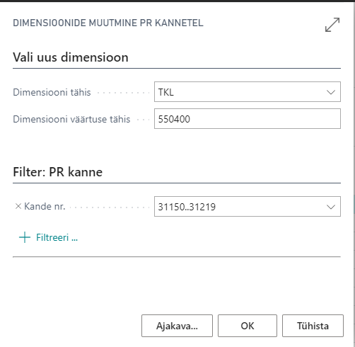 Avaneb vaade, kus tuleb määrata, millise dimensiooni väärtust soovitakse lisada kannetele. Järgmiseks määratakse dimensiooni väärtus, mis kannetele lisatakse.