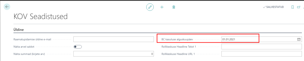 KOV seadistused lehel määratakse “BC kasutuse alguskuupäev”. See kuupäev määrab algsaldo kannete ja reaalajas toimunud kannete perioodi. Kõik kanded, mis on sisestatud antud kuupäevast varasema kuupäevaga on vaikimisi algsaldo kanded ja kõik kanded peale määratud kuupäeva on reaalajas toimunud kanded, mida kasutatakse INF3 aruandes.