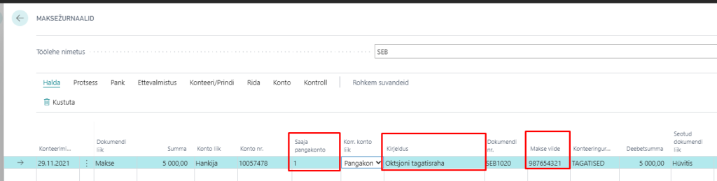 Avanenud maksete žurnaali töölehele kantakse Hankija pangakonto number hankijandmiku kanneteltvõi saab selle käsitsi luua, laekumises olnud viitenumber ja Kirjeldus