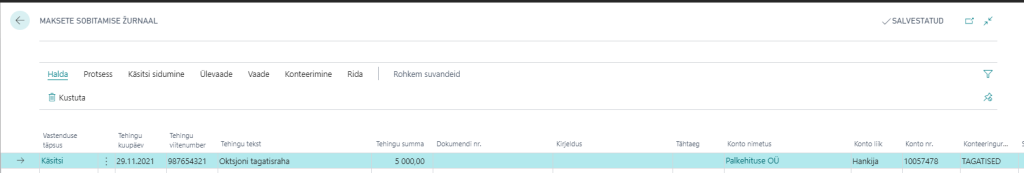 Raamatupidaja impordib pangaväljavõtte maksete sobitamise žurnaali, kus ta seob laekunud tagatisraha hankijaga.
