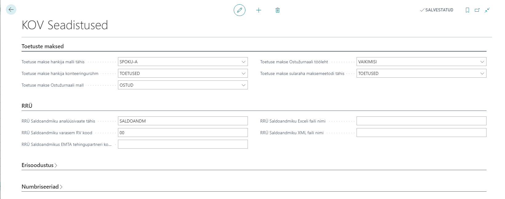 Enne toetuste kasutamist vaja teha vastavad seadistused. Kirjuta otsingusse: „KOV Seadistused“: