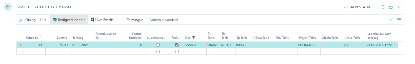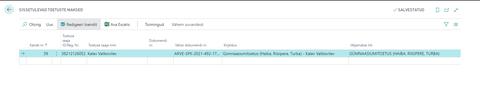 Tabelis kuvatakse toetused üherealiselt, e. ühes reas on kogu toetuse info: