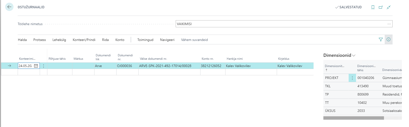 Nii kui andmed on valmis edasi liikumiseks, siis ostužurnaali saab konteerida – see tekitab kulu kanded, mis edaspidi kajastatakse raamatupidamises. Konteerimiseks vajuta: „Konteeri/Prindi / Konteeri“.