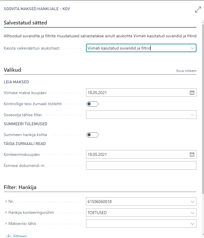 Selleks, et lisada maksmisele kuuluvad read, vajuta: „Ettevalmistus / Soovita maksed hankijale – KOV“. See avab vahevormi:
